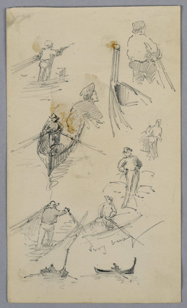 Drawing, Sketches of Figures on Boats; Arnold William Brunner (American, 1857–1925); USA; graphite on paper; 14.1 × 8.4 cm (5 9/16 × 3 5/16 in.); Gift of Mrs. Arnold W. Brunner; 1948-47-281