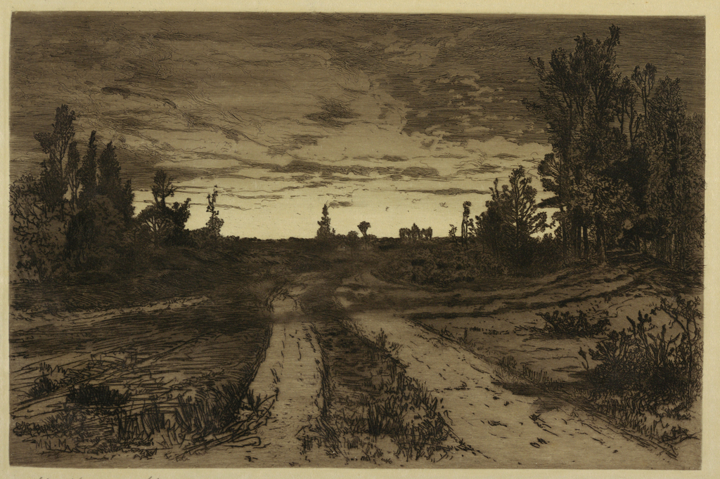 Print, Twilight; Mary Nimmo Moran (1842 – 1899); USA; etching and mezzotint in brown ink on paper; Platemark: 20.4 × 30 cm (8 1/16 × 11 13/16 in.) Sheet: 29.7 × 39.1 cm (11 11/16 × 15 3/8 in.); Bequest of Ruth B. Moran; 1948-71-10