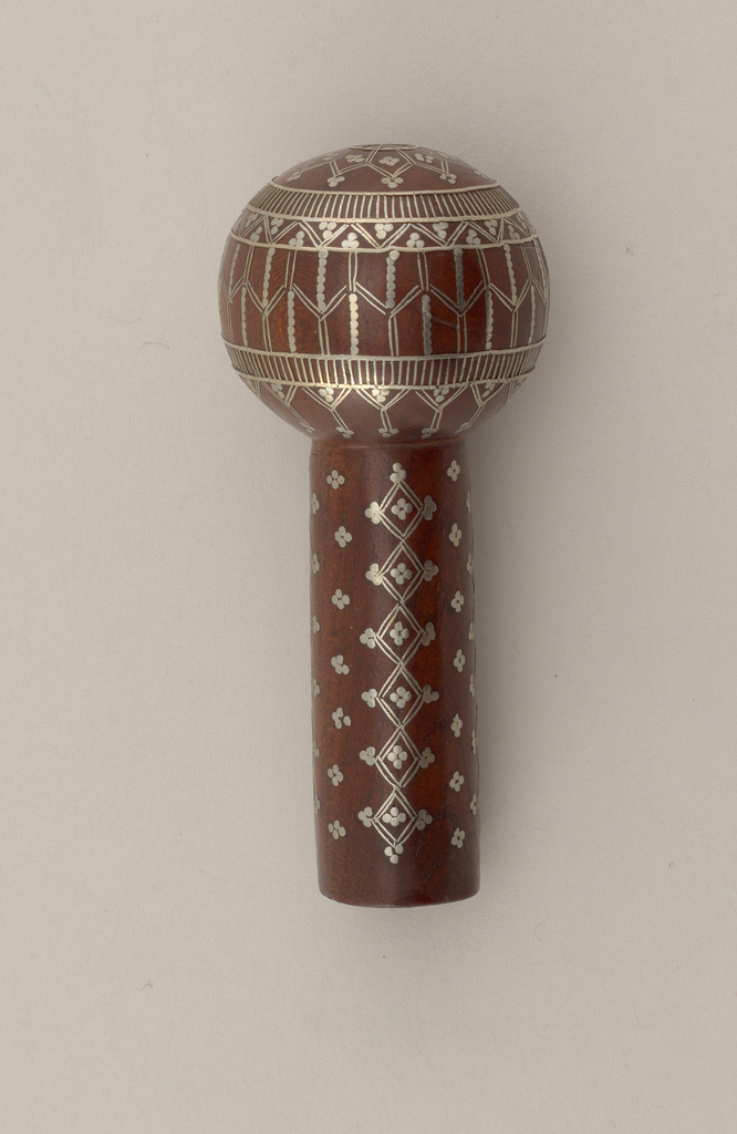 This is a handle. It is dated 19th century and we acquired it in 1949. Its medium is wood, silver. It is a part of the Product Design and Decorative Arts department.