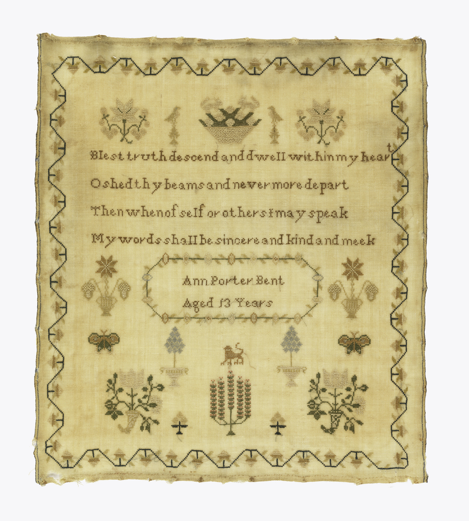 Sampler (England); Embroidered by Ann Porter Bent (English); silk embroidery on wool foundation; H x W: 38.7 x 34.3 cm (15 1/4 x 13 1/2 in.); Bequest of Gertrude M. Oppenheimer; 1981-28-138