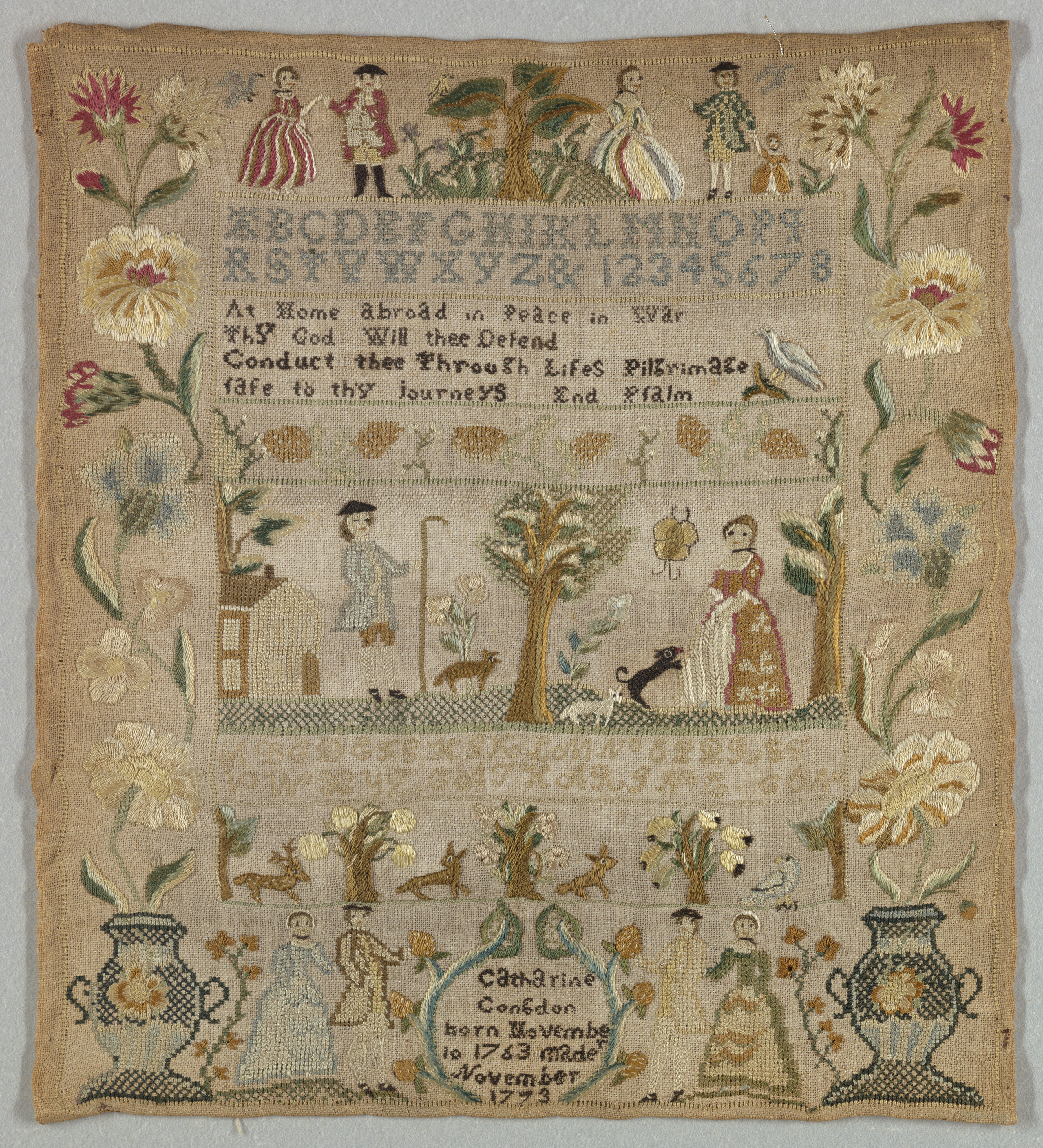 This is a Sampler. It was embroidered by Catharine Congdon. It is dated 1773 and we acquired it in 1981. Its medium is silk embroidery on linen foundation and its technique is embroidered in cross, half-cross, buttonhole, satin, stem, and back stitches on plain weave foundation. It is a part of the Textiles department.