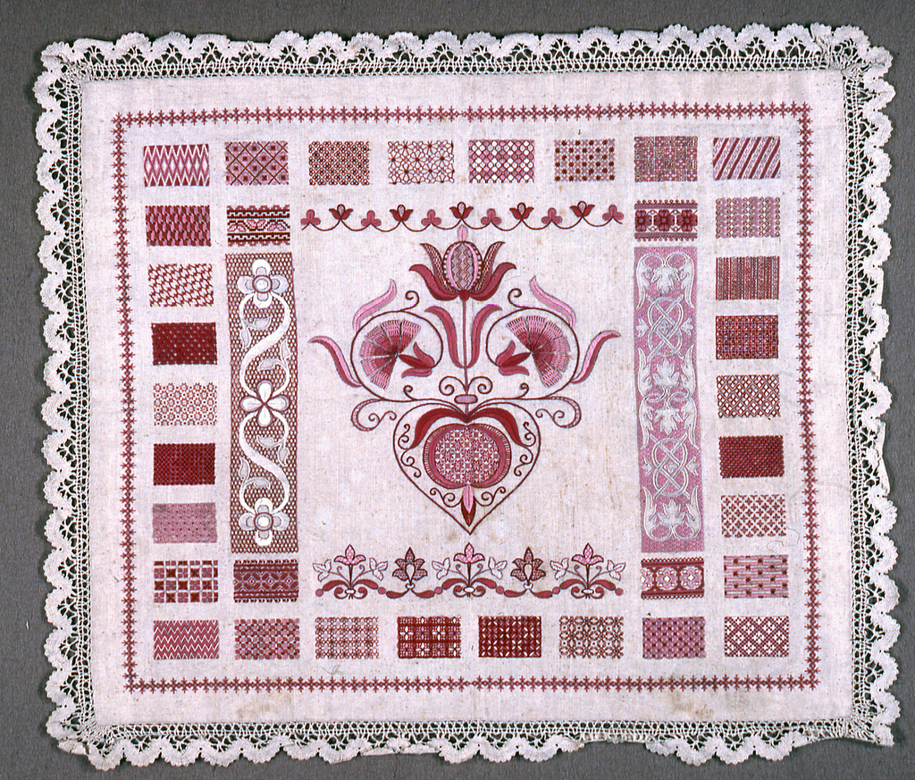 This is a Sampler. It was embroidered by Karoline Berger and student at Kunstgewerbeschule. It is dated 1901 and we acquired it in 1981. Its medium is cotton embroidery on cotton foundation and its technique is embroidered in running, double running, stem, satin, cross, double cross, marking cross, long-armed cross, knots, eyelet, twisted lattice, interlaced trellis, and composite stitches on plain weave foundation. It is a part of the Textiles department.