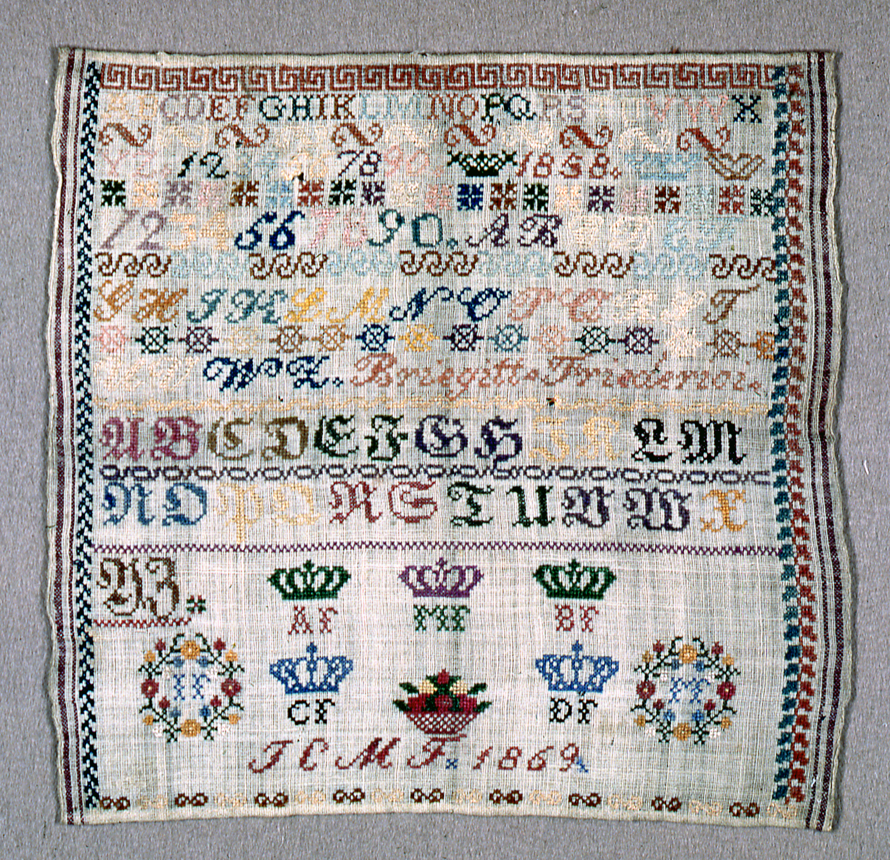 This is a Sampler. It was embroidered by Briegitt Friederici. It is dated 1869 and we acquired it in 1981. Its medium is silk embroidery on wool foundation and its technique is embroidered in cross stitch on plain weave foundation. It is a part of the Textiles department.
