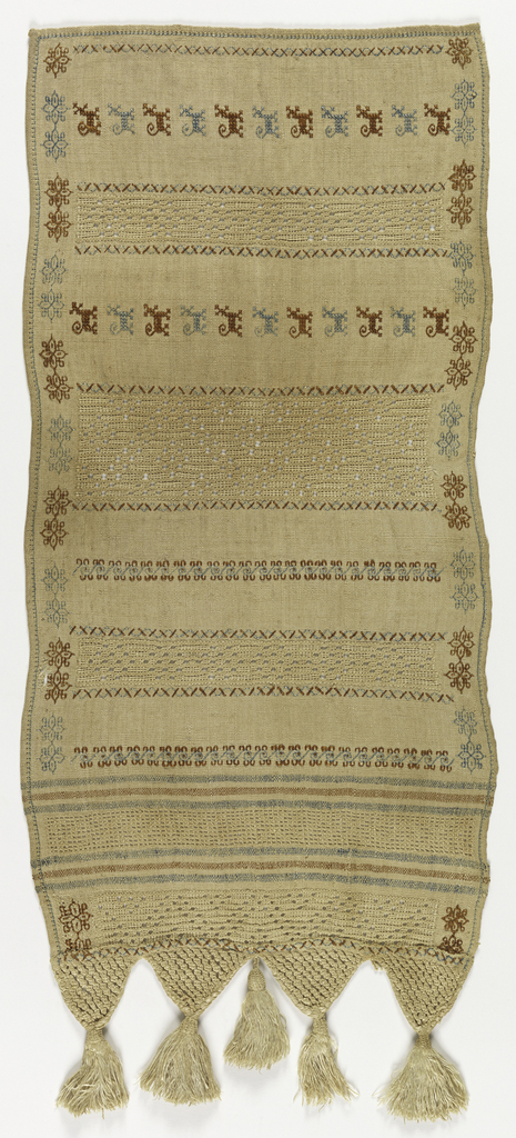 This is a Towel. It is dated 19th century and we acquired it in 1981. Its medium is silk embroidery on linen foundation and its technique is embroidered in cross, back, double running, four sided, and deflected element work on plain weave foundation; end with knotted fringe sewn to towel. It is a part of the Textiles department.
