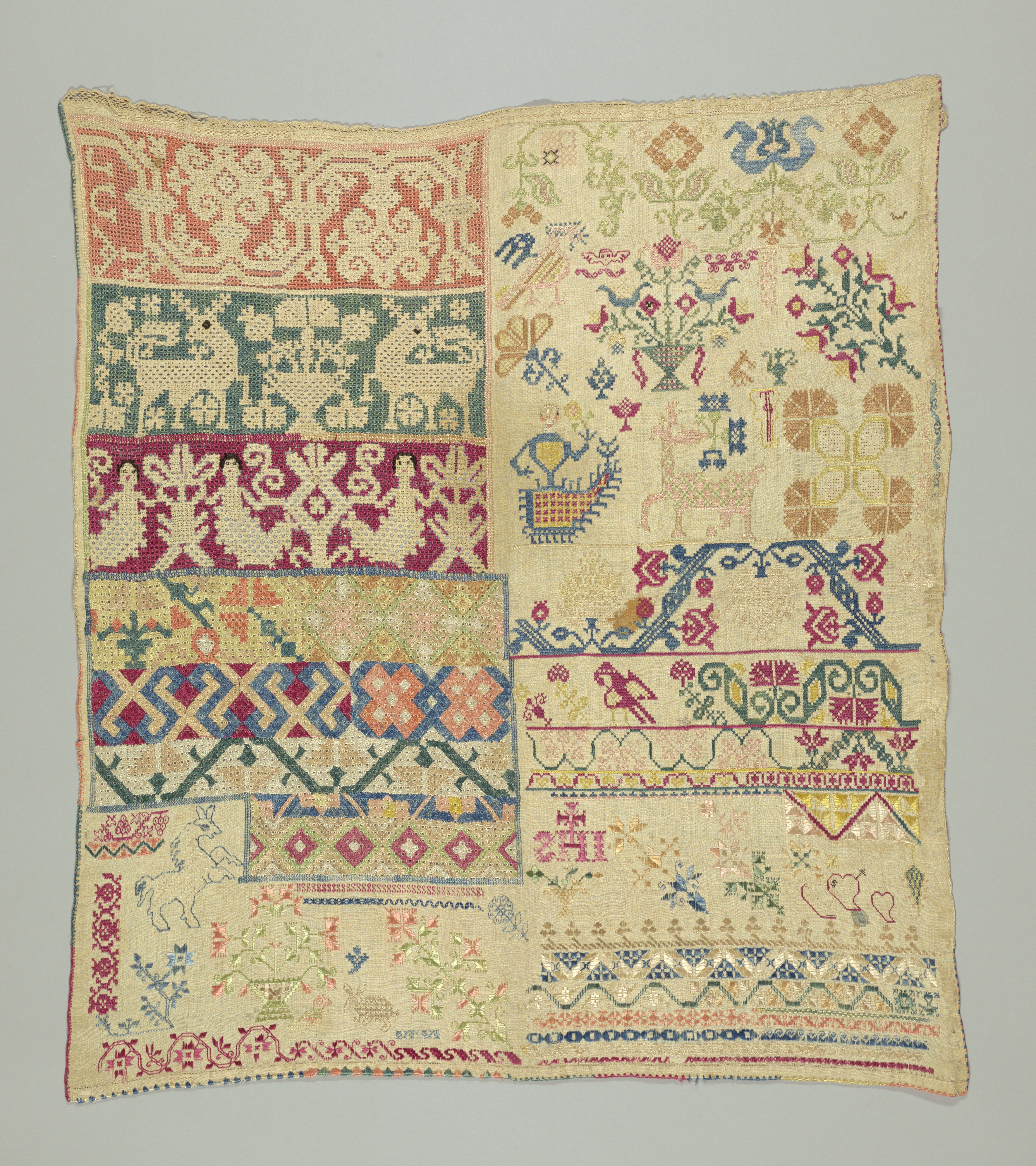 This is a Sampler. It is dated 18th century and we acquired it in 1981. Its medium is silk embroidery on linen foundation and its technique is embroidered in withdrawn element work with satin, cross, double running, four-sided and long-armed cross stitches on plain weave foundation. It is a part of the Textiles department.