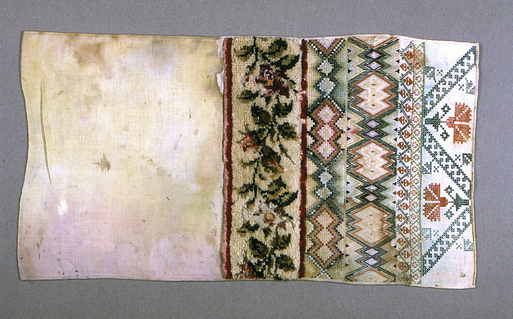 This is a Sampler. It is dated 19th century and we acquired it in 1981. Its medium is wool and silk embroidery on cotton foundation and its technique is embroidered in satin, eyelet, tent, and plush stitches on plain weave foundation. It is a part of the Textiles department.