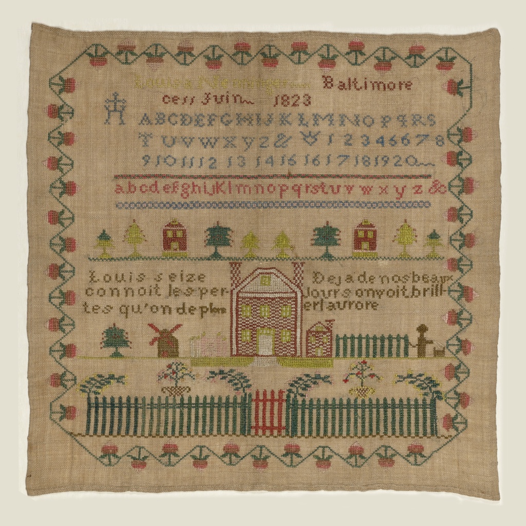 The first line of text on her sampler, "Louis seize connoit les pertes qu'on deplore," refers to the execution of Louis XVI during the French Revolution. The second, "Deja de nos beaux jours on voit briller l'aurore," may reflect the restoration of the Bourbons to the throne, with the return of Louis XVIII from exile. He ruled from 1814 to 1824.