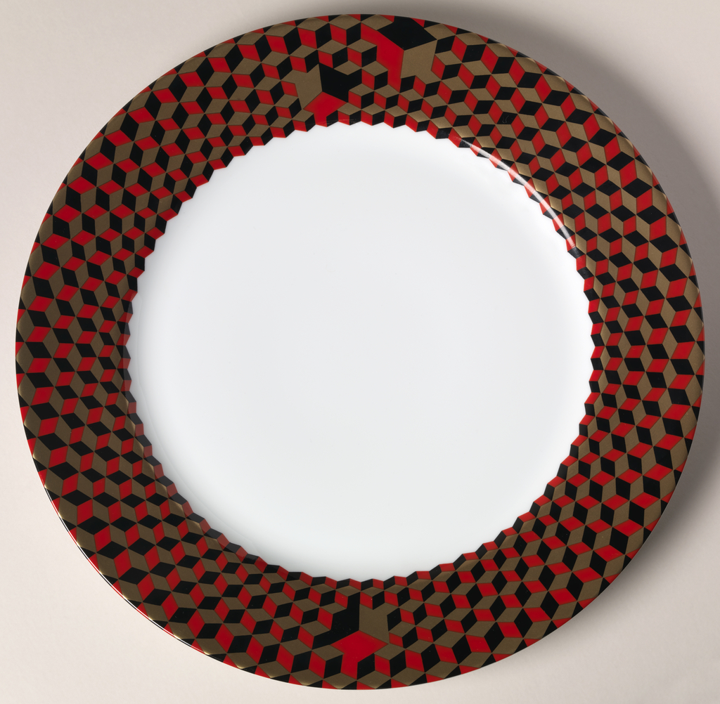 This is a Dinner plate. It was manufactured by Arita Porcelain Company and distributed by Bloomingdale's. It is dated 1985 and we acquired it in 1986. Its medium is gilt, enameled porcelain. It is a part of the Product Design and Decorative Arts department.