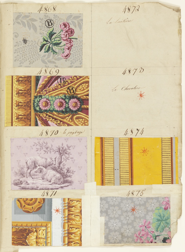 This is a Sample book. It was manufactured by Jacquemart & Bénard. It is dated 1822–30 and we acquired it in 1986. Its medium is block-printed, gilded, flocked, handmade paper. It is a part of the Wallcoverings department.