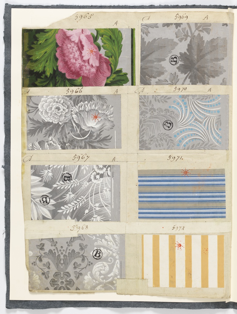 This is a Sample book. It was manufactured by Jacquemart & Bénard. It is dated 1822–30 and we acquired it in 1986. Its medium is block-printed, gilded, flocked, handmade paper. It is a part of the Wallcoverings department.