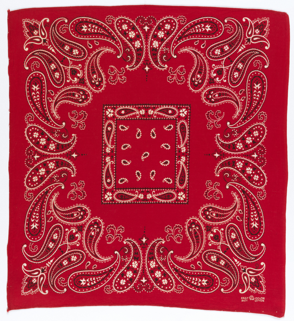 Bandanas, like the paisley motif they commonly feature, can be traced back to India. Indian tie-dyed silk scarves were the inspiration for the patterned handkerchiefs that later became symbolic of the American West.