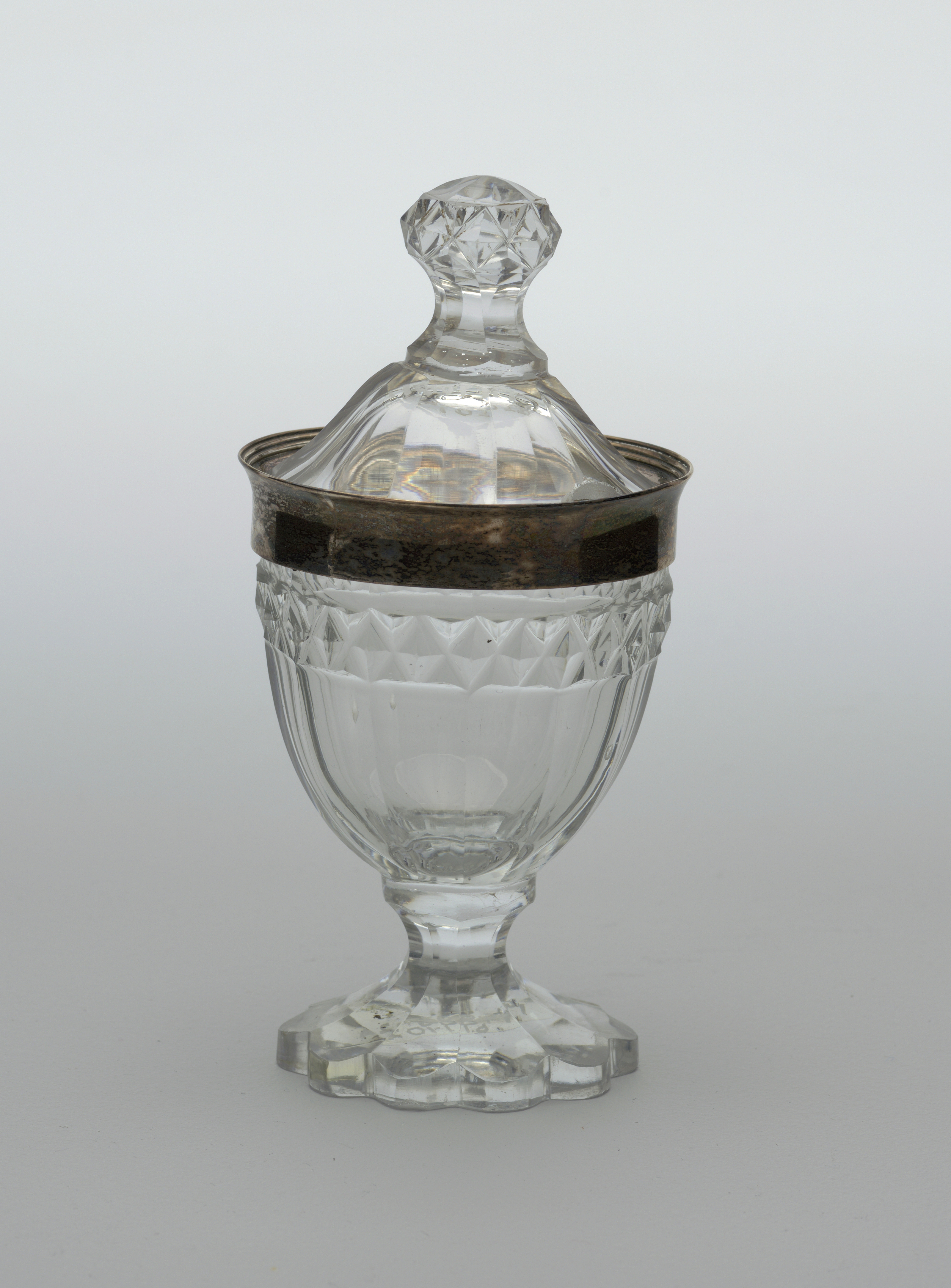 This is a Jar and cover. It was created by Henry Chawner. It is dated ca. 1795 and we acquired it in 1986. Its medium is glass, silver. It is a part of the Product Design and Decorative Arts department.