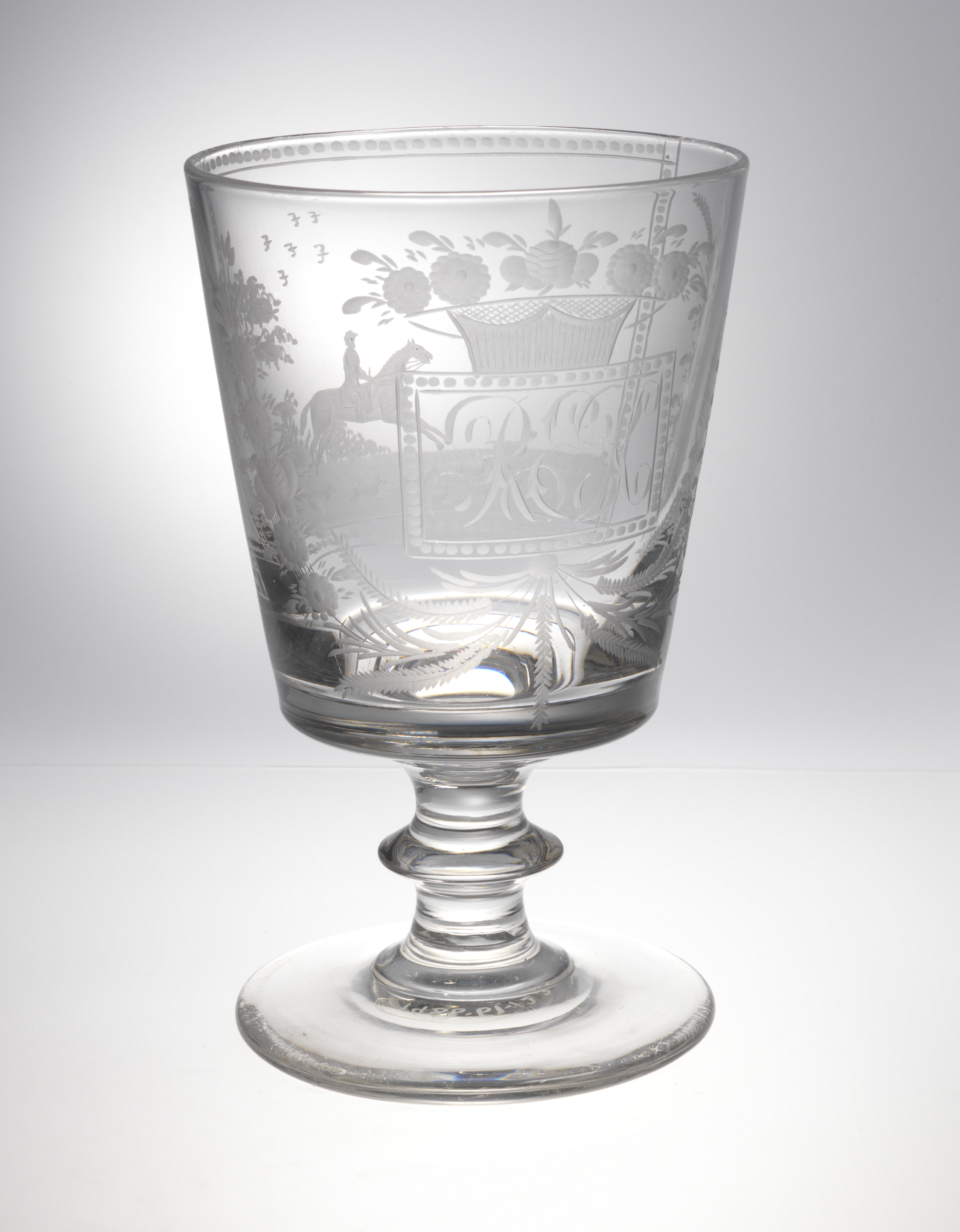 Goblet with Hunting Scene Goblet; England; glass; H x W: 18.2 x 11.2cm (7 3/16 x 4 7/16in.); Bequest of Walter Phelps Warren; 1986-61-123
