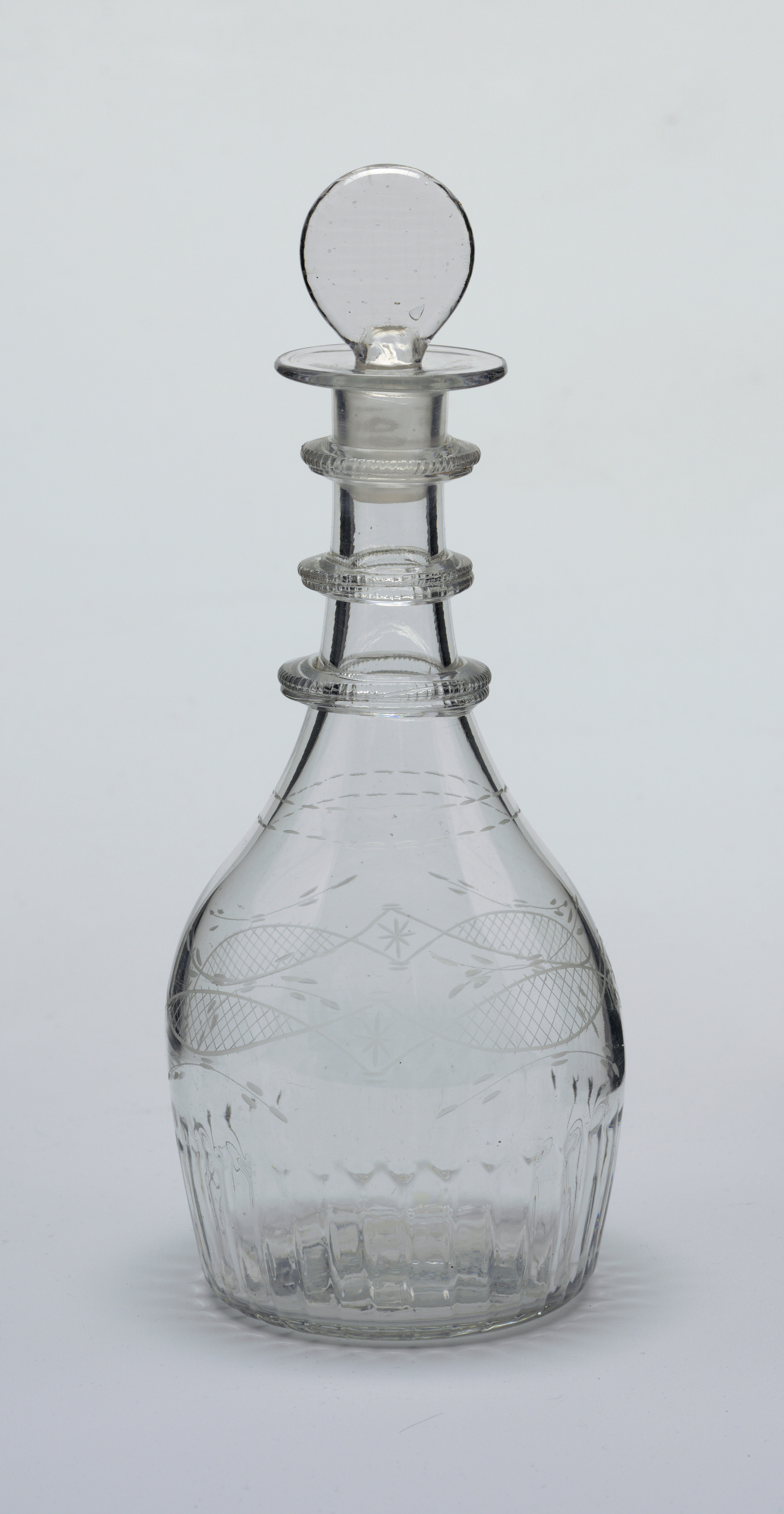 This is a decanter. It was manufactured by Cork Glass Company. It is dated ca. 1783–1818 and we acquired it in 1986. Its medium is glass. It is a part of the Product Design and Decorative Arts department.