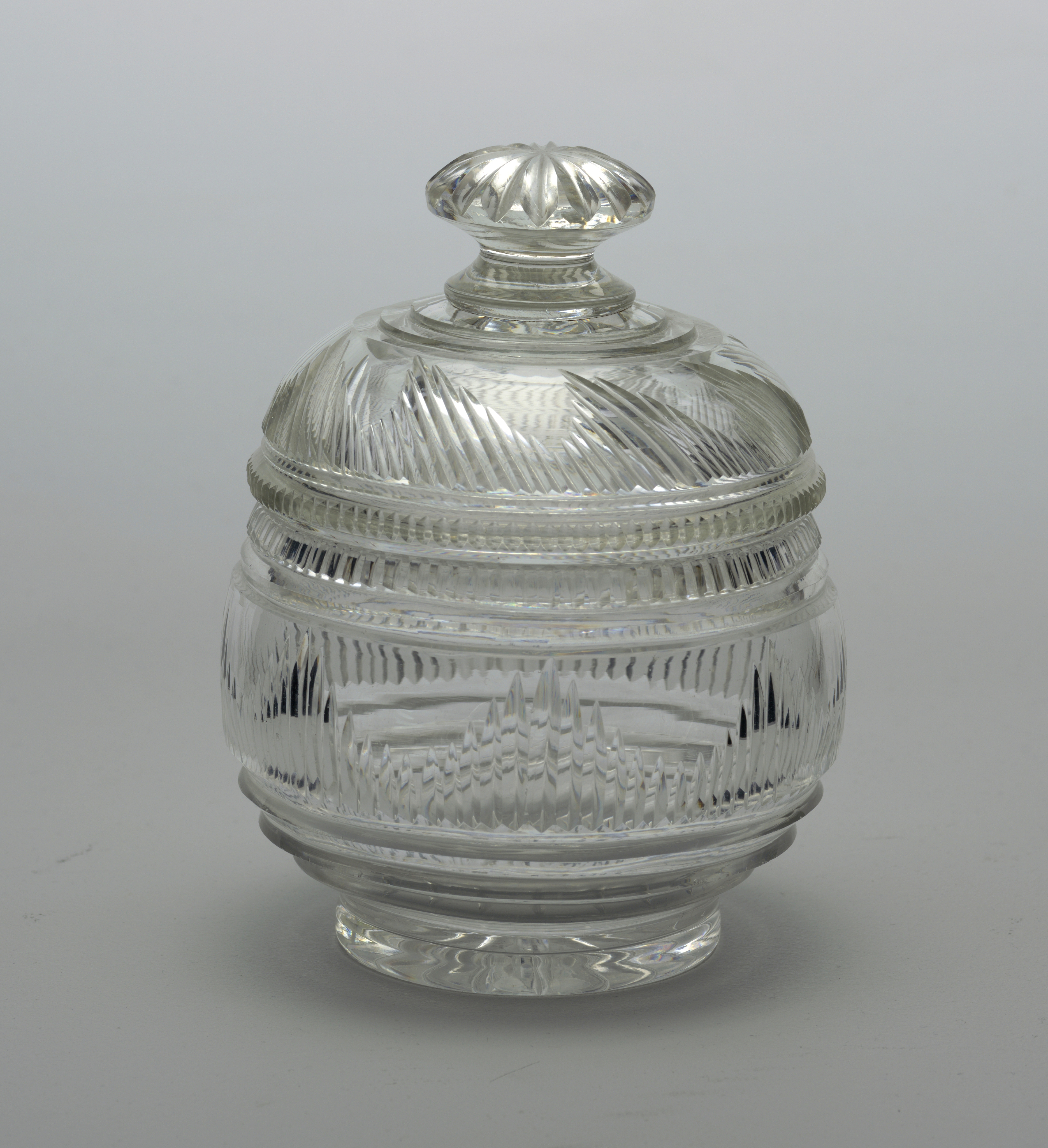 This is a Jar and lid. It is dated ca. 1810 and we acquired it in 1986. Its medium is glass. It is a part of the Product Design and Decorative Arts department.