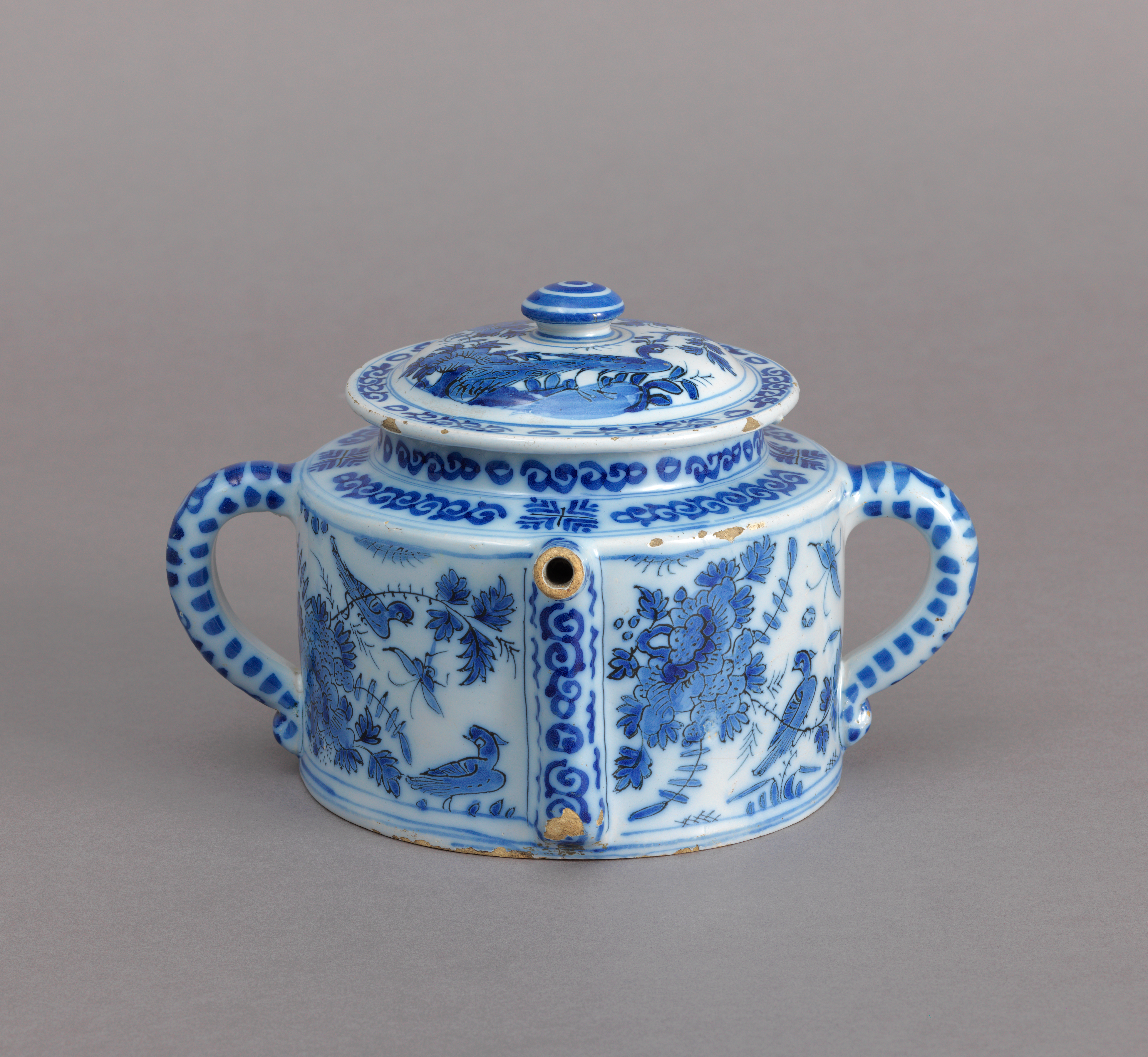 This is a posset pot. It was manufactured by de Paeuw (the Peacock Factory). It is dated 1705–40 and we acquired it in 1986. Its medium is tin-glazed earthenware. It is a part of the Product Design and Decorative Arts department.