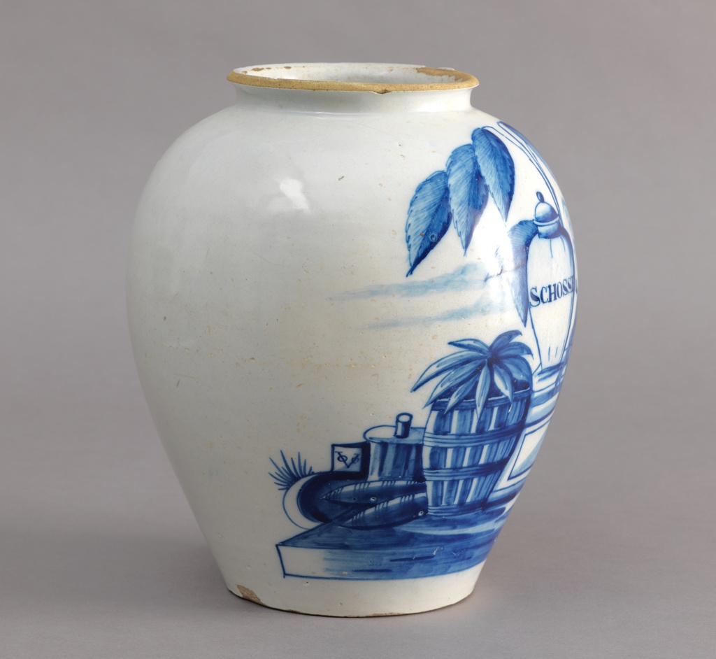 This is a Jar. It was manufactured by Vergulde Bloempot [de] (the Golden Flowerpot). It is dated ca. 1735–65 and we acquired it in 1986. Its medium is tin-glazed earthenware. It is a part of the Product Design and Decorative Arts department.