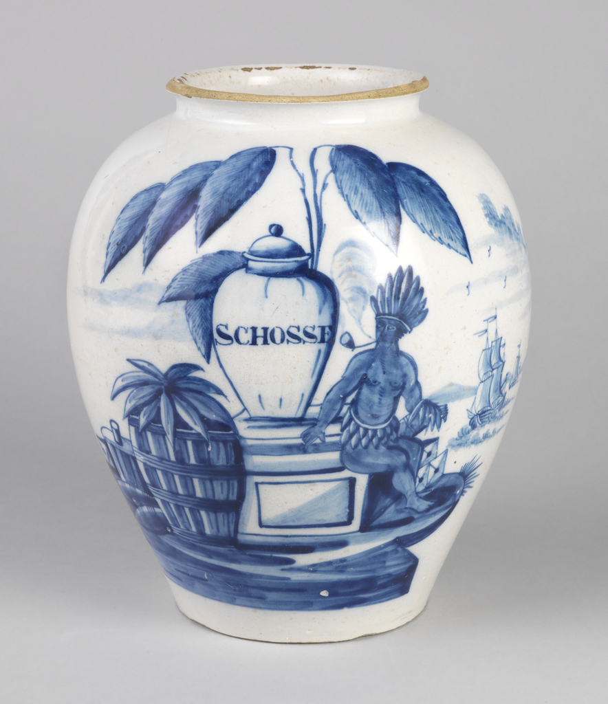 This is a Jar. It was manufactured by Vergulde Bloempot [de] (the Golden Flowerpot). It is dated ca. 1735–65 and we acquired it in 1986. Its medium is tin-glazed earthenware. It is a part of the Product Design and Decorative Arts department.