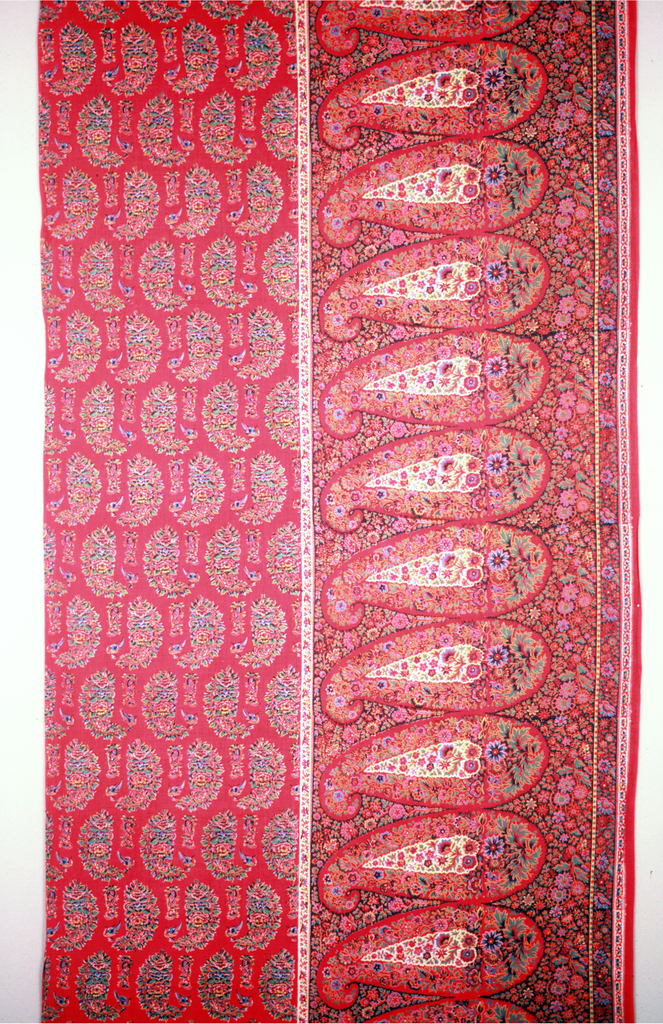 In addition to their beautiful complex patterning, European-printed paisleys showcased the latest advances in textile dye chemistry, including the discharge and discharge and replace methods. These allowed for bright, clear colors to be printed on a deep colored ground, like this saturated Turkey red.