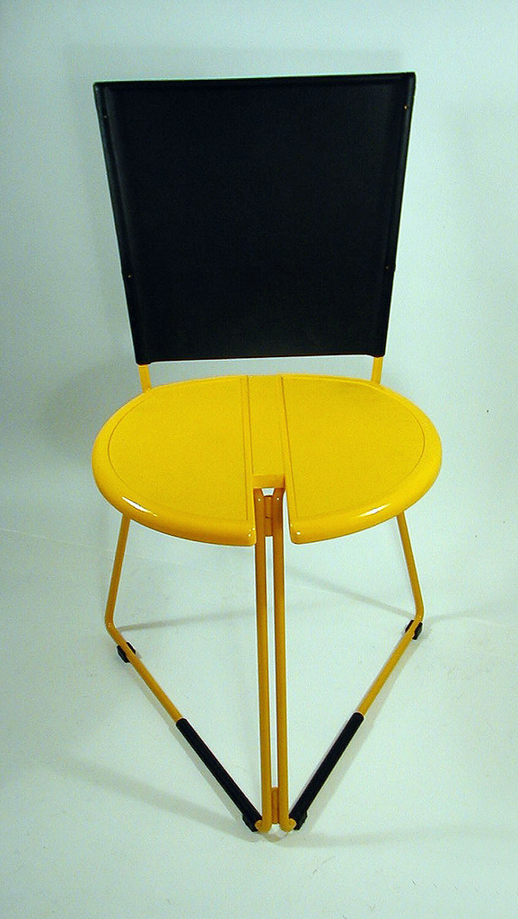 This is a chair. It was designed by G. Cairoli and manufactured by Seccose. It is dated 1985–86 and we acquired it in 1986. Its medium is steel, enamel, rubber, plastic. It is a part of the Product Design and Decorative Arts department.