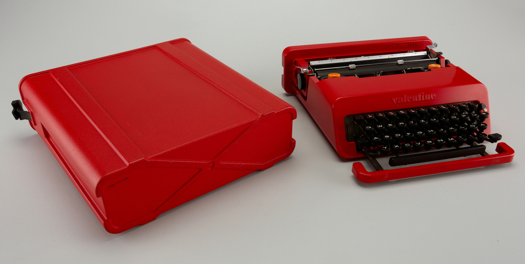 Valentine Typewriter And Case; Designed by Ettore Sottsass (Italian, 1917–2007); Italy; molded abs plastic, metal, rubber; H x W x D (a): 10.3 x 33 x 34 cm (4 1/16 in. x 13 in. x 13 3/8 in.) H x W x D (a, b: with case): 11.5 x 34.5 x 35.5 cm (4 1/2 in. x 13 9/16 in. x 14 in.); Gift of Barry Friedman and Patricia Pastor; 1986-99-40-a,b