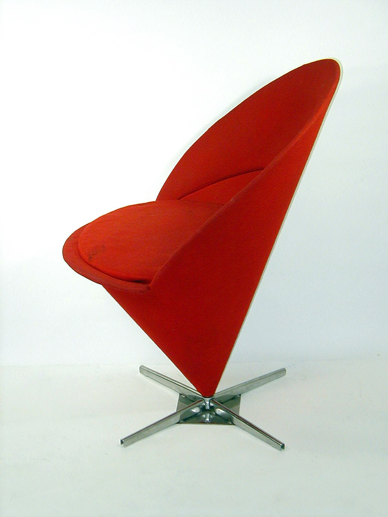 Danish designer and architect Werner Panton created some of his greatest designs from experimenting with form, materials, and rich color, the latter being one of Panton’s trademarks. Color was often a focal point in his furnishings, as seen in this vibrant red, futuristic looking cone chair. In his later work, Panton created rooms as total environments, focusing on textiles as coordinating elements and a means of expressing color in a unified interior.