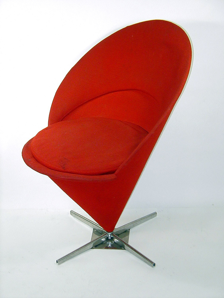 Danish designer and architect Werner Panton created some of his greatest designs from experimenting with form, materials, and rich color, the latter being one of Panton’s trademarks. Color was often a focal point in his furnishings, as seen in this vibrant red, futuristic looking cone chair. In his later work, Panton created rooms as total environments, focusing on textiles as coordinating elements and a means of expressing color in a unified interior.