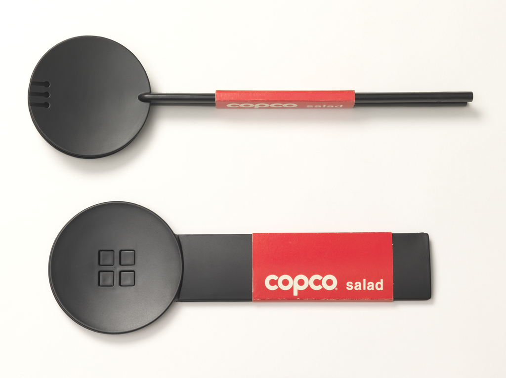 This is a salad servers. It was design team member: Tucker Viemeister, Davin Stowell, Tom Dair, John Lonczak, Brent Markee, Linda Celantano and Annie Breckenfeld and manufactured by Copco and firm: Smart Design, Inc.. It is dated 1986 and we acquired it in 1987. Its medium is plastic (injection molded polystyrene). It is a part of the Product Design and Decorative Arts department.