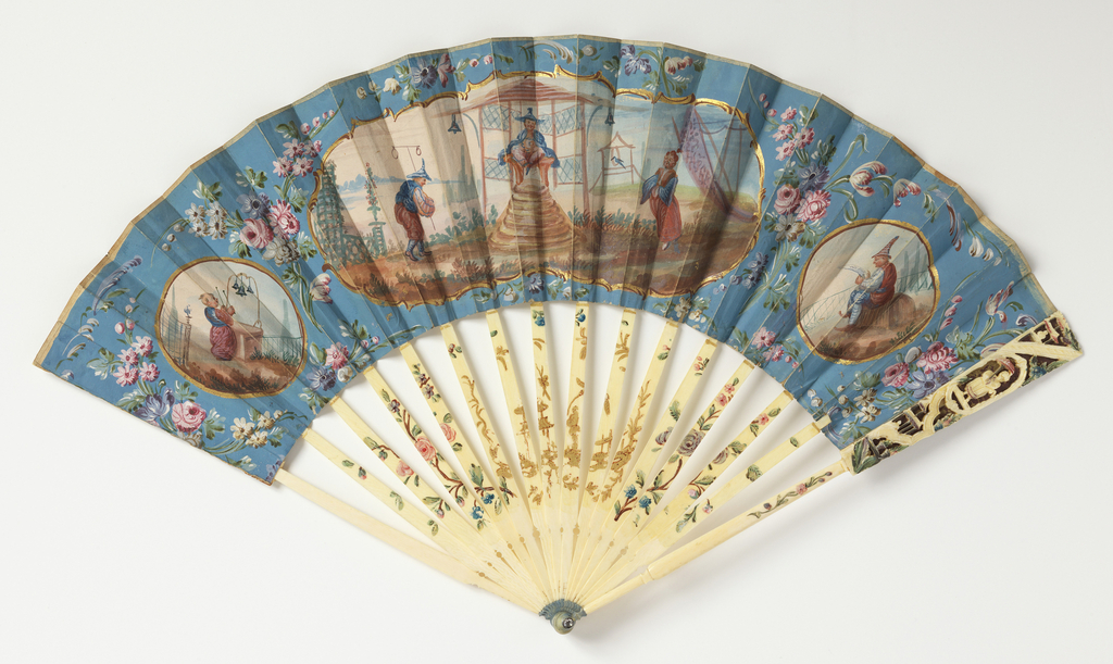 This is a Pleated fan. It is dated 18th century and we acquired it in 1987. Its medium is painted and gilded paper leaf, carved and painted ivory sticks with foil behind guards, glass stone at rivet. It is a part of the Textiles department.