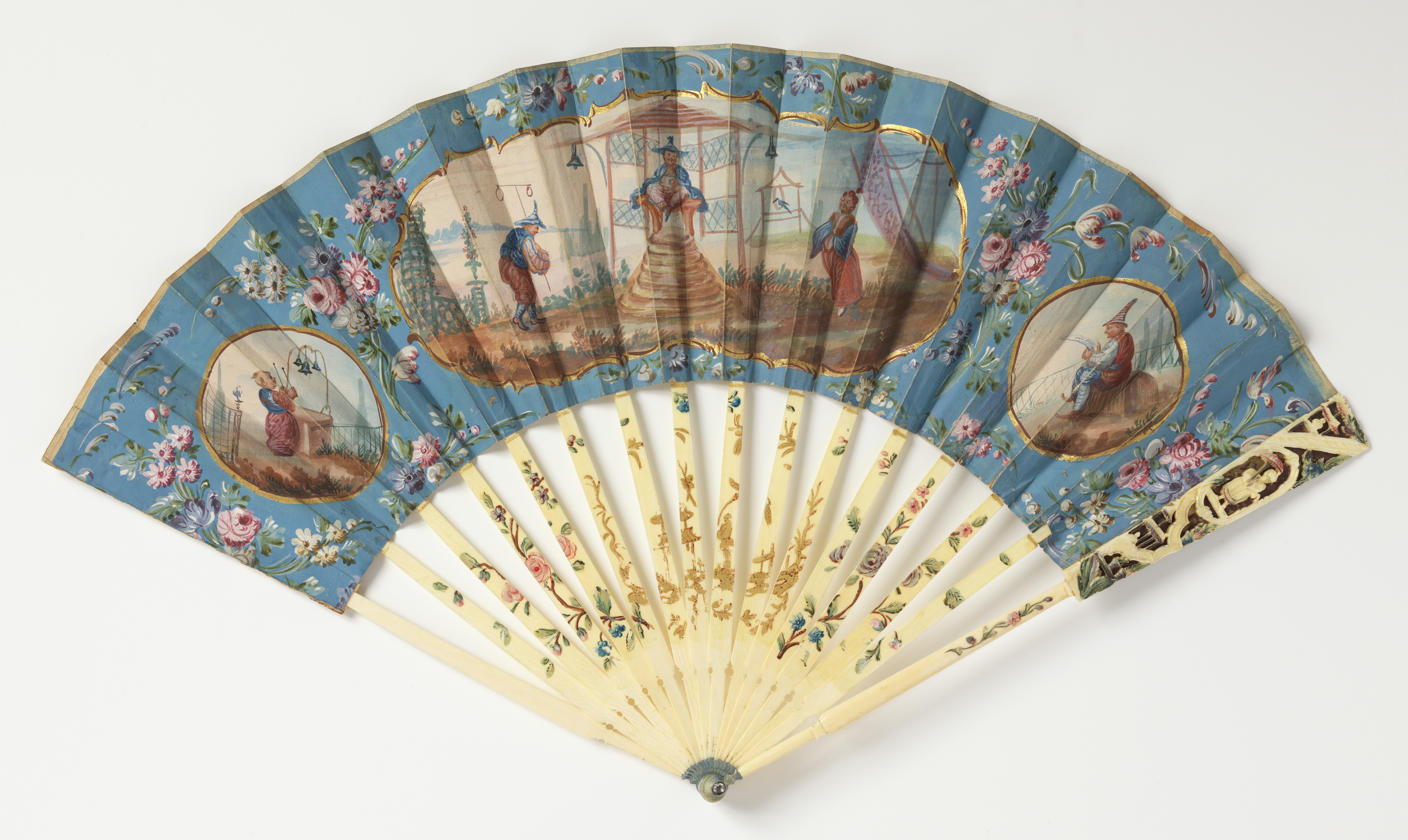 This is a Pleated fan. It is dated 18th century and we acquired it in 1987. Its medium is painted and gilded paper leaf, carved and painted ivory sticks with foil behind guards, glass stone at rivet. It is a part of the Textiles department.
