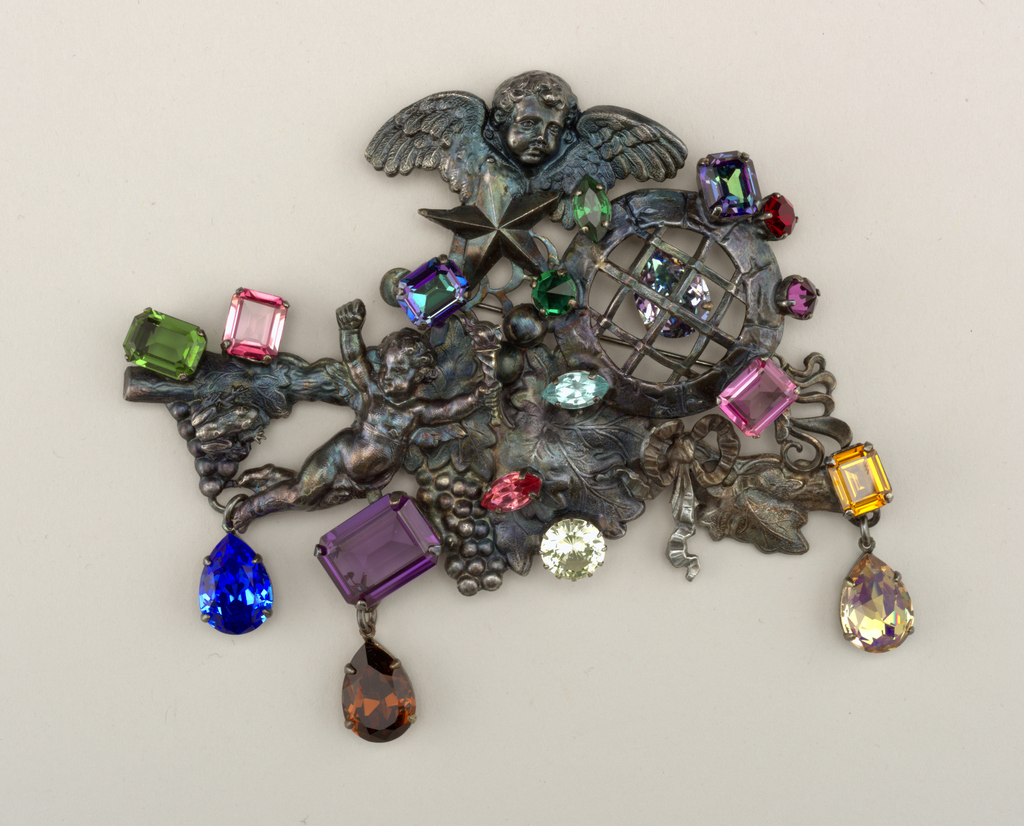 This is a brooch. It was designed by Torben Hardenberg. It is dated 1987 and we acquired it in 1987. Its medium is patinated brass, glass. It is a part of the Product Design and Decorative Arts department.
