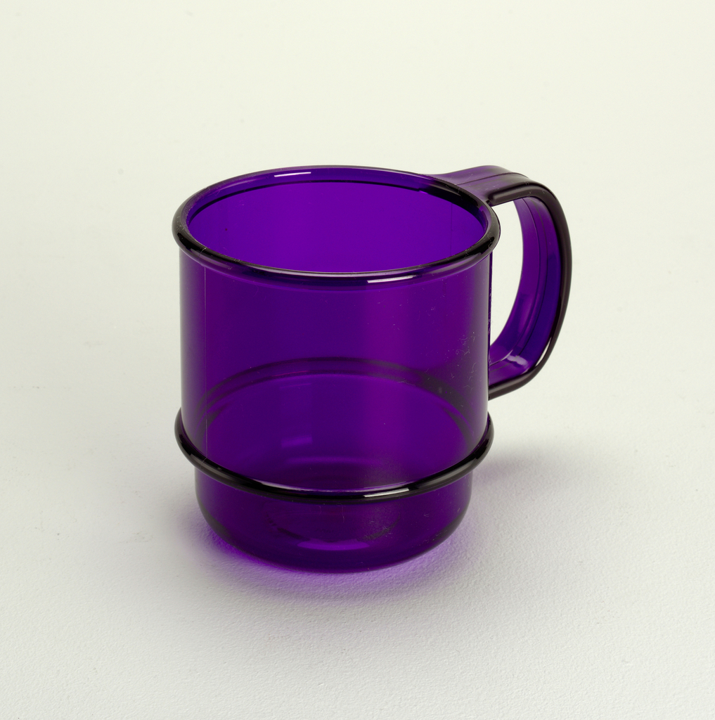 This is a Mug. It was designed by George Schmidt, Inc. and manufactured by George Schmidt, Inc. and distributed by IDG Marketing. It is dated ca. 1987 and we acquired it in 1988. Its medium is plastic (co-extruded crystal styrene and high-impact styrene). It is a part of the Product Design and Decorative Arts department.