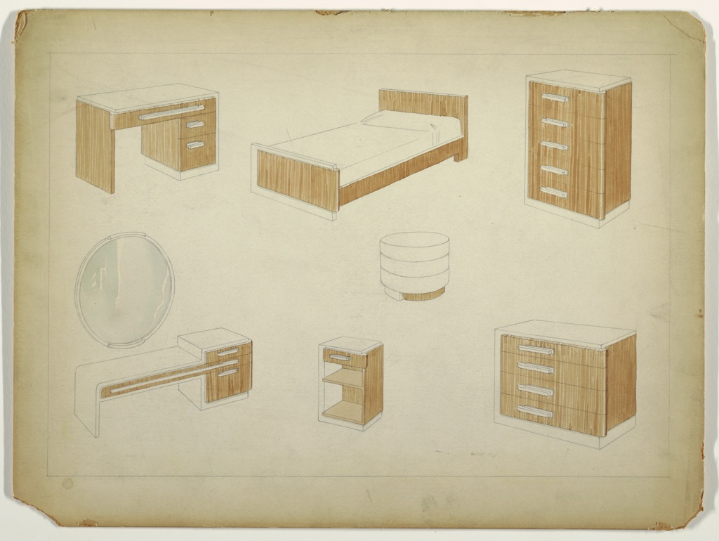 Drawing, Design for a Bedroom Suite in Lacquer and Wood; Office of Donald Deskey Associates, Donald Deskey (American, 1894–1989); USA; brush and brown and green watercolor, graphite on cream illustration board; 38 x 50.8 cm (14 15/16 x 20 in. ); Gift of Donald Deskey; 1988-101-1010