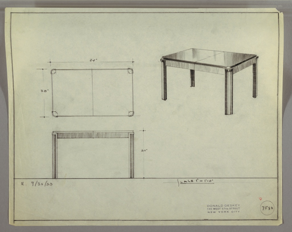 Drawing, Table; Office of Donald Deskey Associates, Donald Deskey (American, 1894–1989); Drafted by K.; Manufactured by Kroehler Manufacturing Co.; USA; graphite on tracing paper; 29.5 x 36.9 cm (11 5/8 x 14 1/2 in.); Gift of Donald Deskey; 1988-101-1091