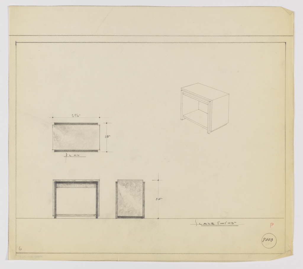 Inscribed in graphite, lower left: 6; in red color pencil, lower right: P; in graphite, lower right: 8003 [encircled]; in graphite, lower left: SCALE 1"—1'–0"; in graphite: object views and dimensions