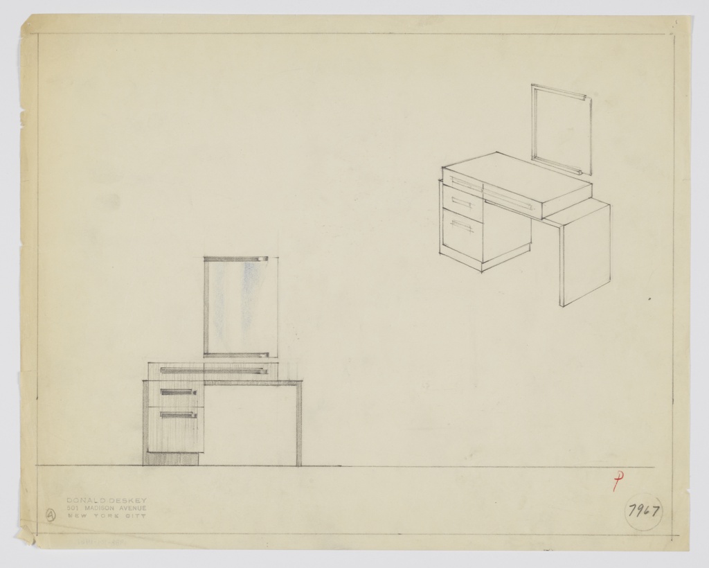 This is a Drawing. It was from the office of Donald Deskey Associates and Donald Deskey. It is dated 1934–1935 and we acquired it in 1988. Its medium is graphite, blue color pencil on tracing paper. It is a part of the Drawings, Prints, and Graphic Design department.