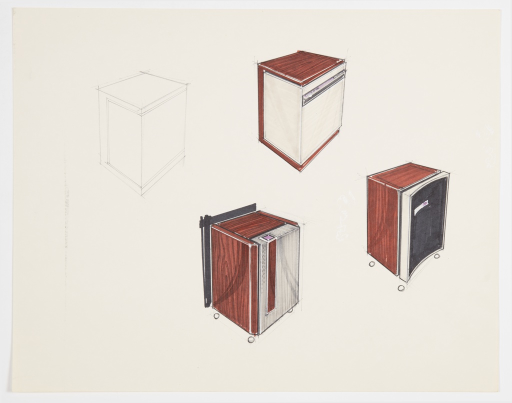 Drawing, Four Designs for Air Purifiers; Drafted by Tom Aldrich; Office of Donald Deskey Associates; USA; pen and black ink, brush and watercolor, graphite, white heightening on beige wove paper; 28 x 35.5 cm (11 x 14 in.); Gift of Donald Deskey; 1988-101-1693