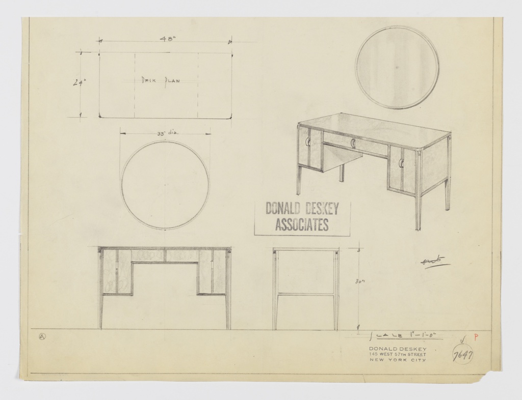 Drawing, Design for Desk or Vanity Table and Mirror; Office of Donald Deskey (American, 1894–1989); graphite on tracing paper; 28 × 37.1 cm (11 in. × 14 5/8 in.); Gift of Donald Deskey; 1988-101-1978