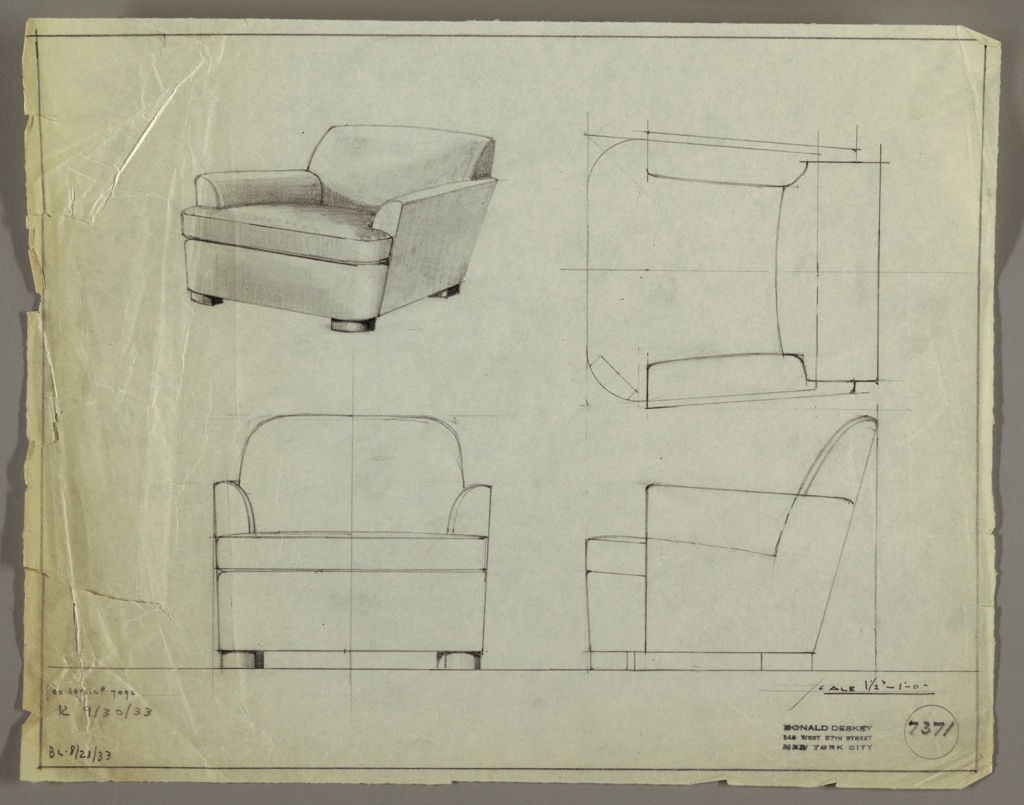 This is a Drawing. It was from the office of Donald Deskey and drafted by K. and manufactured by Kroehler Manufacturing Co.. It is dated September 30, 1933 and we acquired it in 1988. Its medium is graphite on tracing paper. It is a part of the Drawings, Prints, and Graphic Design department.