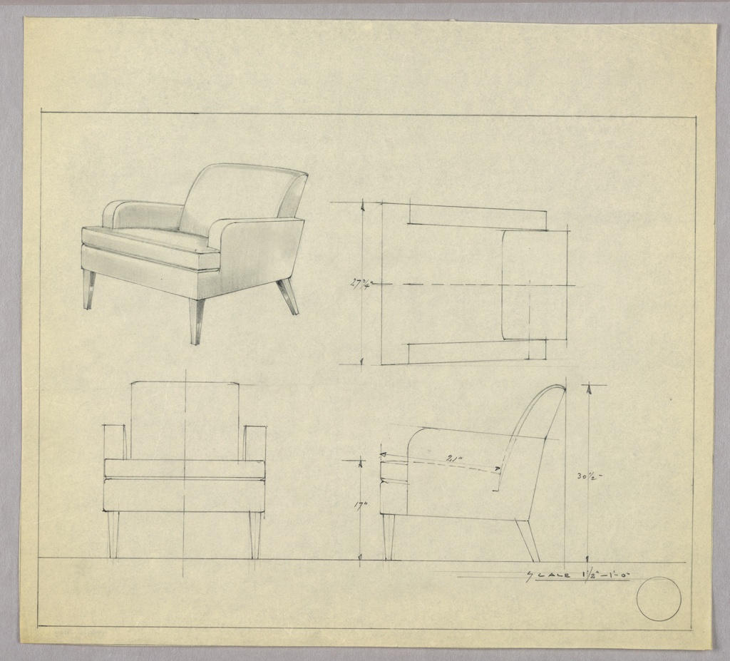 Drawing, Armchair; Office of Donald Deskey Associates, Donald Deskey (American, 1894–1989); USA; graphite on tracing paper; 34.1 x 37.6 cm (13 7/16 x 14 13/16 in.); Gift of Donald Deskey; 1988-101-489