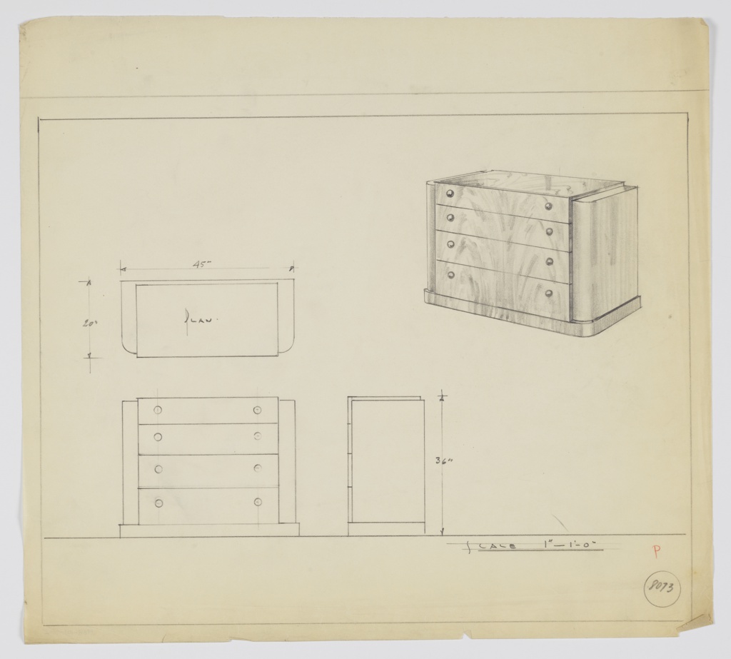 Drawing, Design for Chest of Drawers; Office of Donald Deskey (American, 1894–1989), Donald Deskey Associates; USA; graphite on tracing paper; 34.5 x 38 cm (13 9/16 x 14 15/16 in.); Gift of Donald Deskey; 1988-101-662