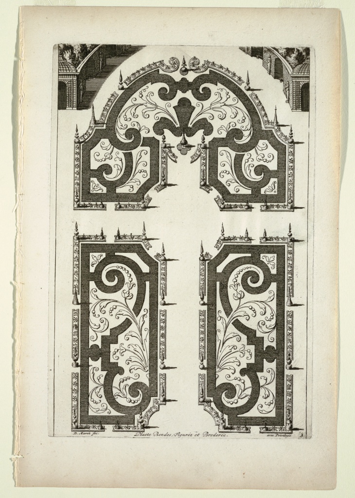 <ref name=CH>{{cite web |url=https://www-6.collection.cooperhewitt.org/objects/18628531/ |title=Print, Plaete Bendes, Figuréz et Broderée, in Nouveaux Livre de Parterres contenant 24 pensséz diferantes (New Book Containing 24 Different Variations for Garden Beds) |author=Cooper Hewitt, Smithsonian Design Museum |accessdate=19 December 2025 |publisher=Smithsonian Institution}}</ref>