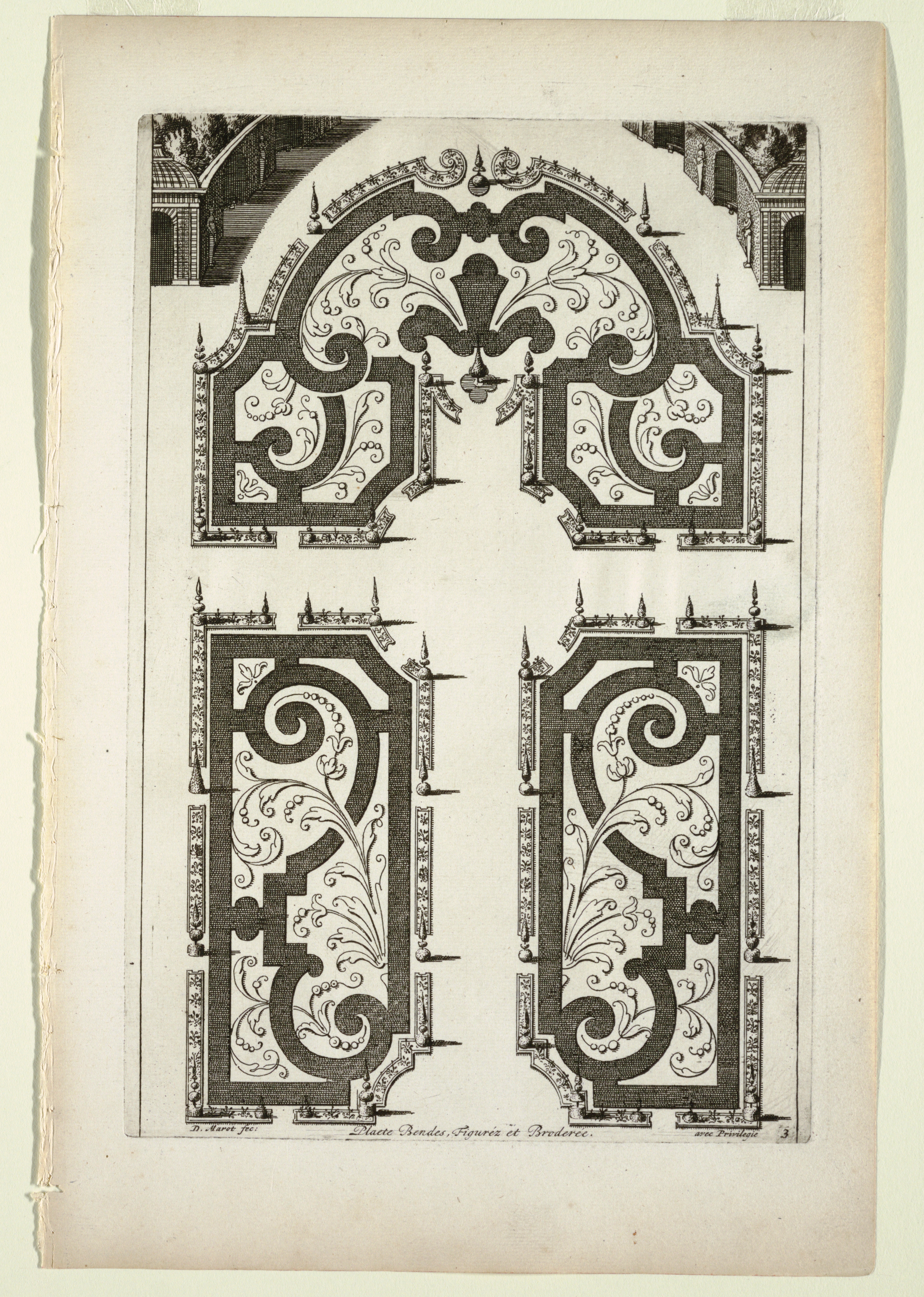 Print, Plaete Bendes, Figuréz et Broderée, in Nouveaux Livre de Parterres contenant 24 pensséz diferantes (New Book Containing 24 Different Variations for Garden Beds); Designed by Daniel Marot (French, active in the Netherlands and England, 1661–1752); Netherlands; etching and engraving on white laid paper; Sheet: 35 x 23.5 cm (13 3/4 x 9 1/4 in.) Platemark: 28.7 x 19.5 cm (11 5/16 x 7 11/16 in.); Museum purchase from General Acquisitions Endowment Fund; 1988-4-21