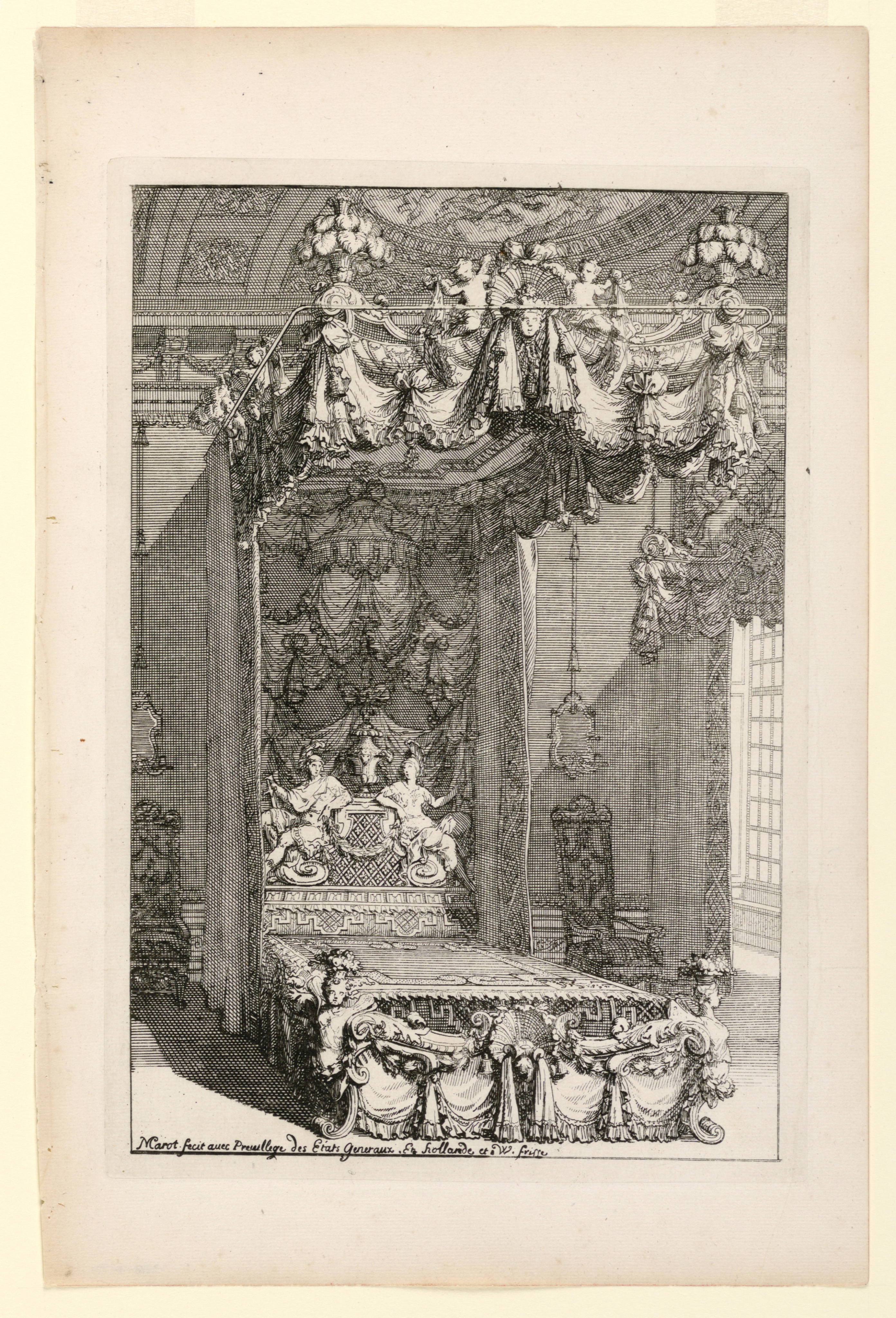 An ostentatious bed dominates in this etching by Daniel Marot, the French designer and architect who served as the chief designer to William of Orange, later King William III of England. This design is for a state bed (lit d’apparat), which was purely ceremonial rather than functional, and kept in royal palaces and country residences in the event of a visit from a monarch At the center of the canopy, two putti present a large classical mask. The headboard features an ornate design composed of two classical figures, likely Minerva, seated below a tent-like motif. Putti with baskets frame the foot of the bed and the bed skirt echoes the cresting of the tester. To the right is a doorway with an equally elaborate canopy and light streams in from unseen windows. This is one of several designs for state beds in Marot’s Second Livre d'Appartement. The state bed would have been one of the costliest items in state apartments due to the high price of the textiles involved. Marot’s design offers a glimpse at a time when beds, alongside other items of interior furnishings, were integral aspects in courtly ceremony.