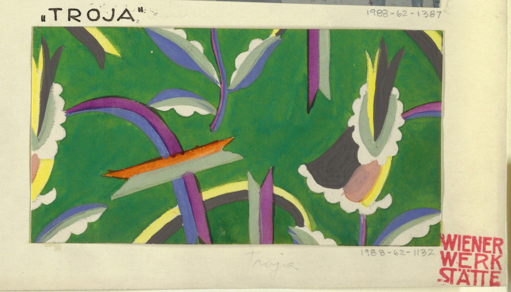 Drawing, Textile Design: Troja; Designed by Reni Schaschl-Schuster (Austrian, 1895 - 1979); Made for Wiener Werkstätte (Austria); brush and gouache on paper; 6.5 × 12.4 cm (2 9/16 × 4 7/8 in.) Mat: 31.4 × 45.1 cm (12 3/8 × 17 3/4 in.); Museum purchase from Smithsonian Collections Acquisition and Decorative Arts Association Acquisition Funds; 1988-62-1132