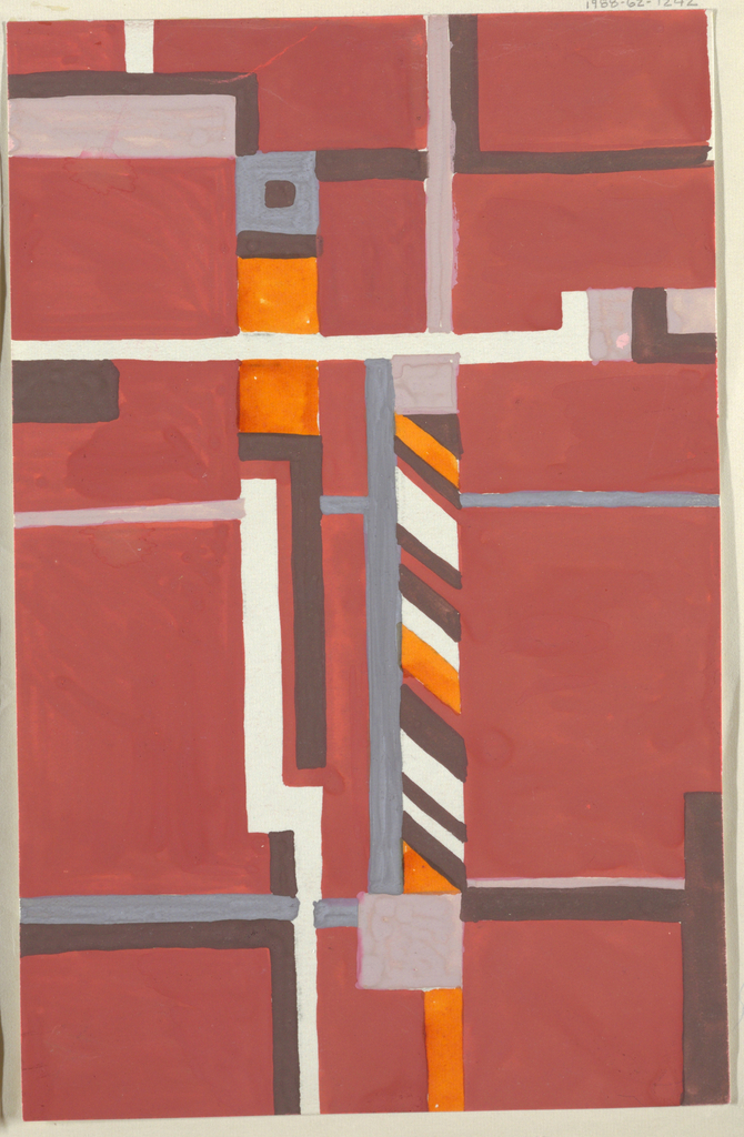 Drawing, Textile Design: Rhodos; Made for Wiener Werkstätte (Austria); brush and gouache on paper; 21 × 13.3 cm (8 1/4 × 5 1/4 in.) Mat: 55.9 × 40.6 cm (22 × 16 in.); Museum purchase from Smithsonian Collections Acquisition and Decorative Arts Association Acquisition Funds; 1988-62-1242