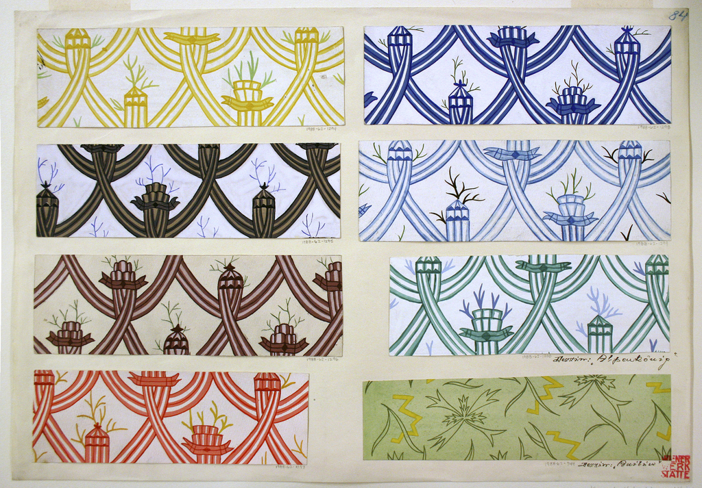 Drawing, Textile Design: Alpenkönig (King of the Alps); Designed by Gertrude Weinberger (Hungarian, active Austria, 1897 - 1920); Made for Wiener Werkstätte (Austria); brush and gouache, graphite on paper; 6.7 x 20.5 cm (2 5/8 x 8 1/16 in. ); Museum purchase from Smithsonian Collections Acquisition and Decorative Arts Association Acquisition Funds; 1988-62-1298