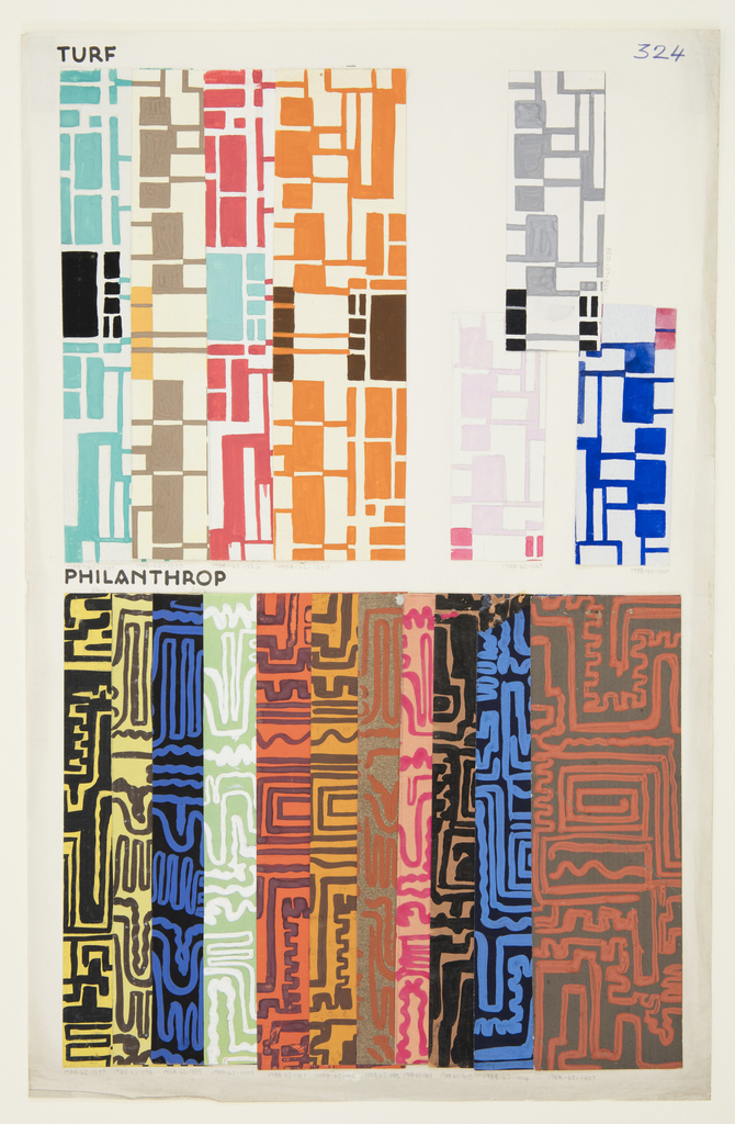 Drawing, Textile Design: Philanthrop; Designed by Franz von Zülow ((Austrian, 1883–1963)); Made for Wiener Werkstätte (Austria); brush and gouache on paper; 20.3 × 2.5 cm (8 × 1 in.) Mat: 40.6 × 50.8 cm (16 × 20 in.); Museum purchase from Smithsonian Collections Acquisition and Decorative Arts Association Acquisition Funds; 1988-62-1400