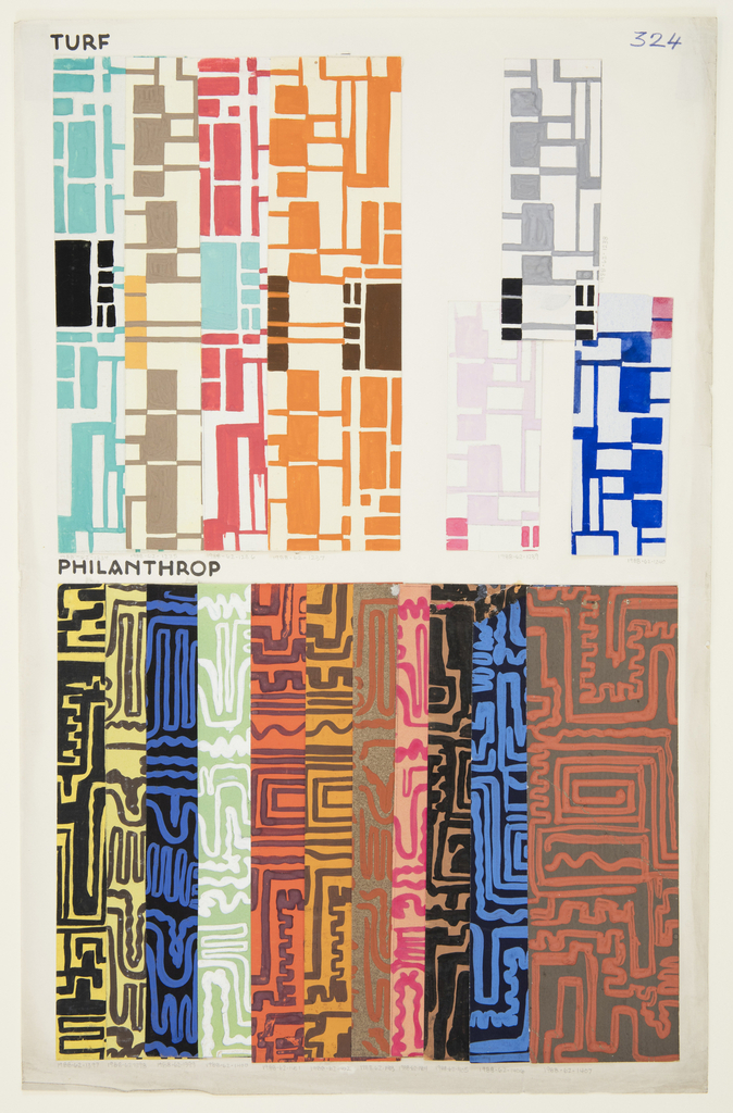 Drawing, Textile Design: Philanthrop; Designed by Franz von Zülow ((Austrian, 1883–1963)); Made for Wiener Werkstätte (Austria); brush and gouache on paper; 20.3 × 2.5 cm (8 × 1 in.) Mat: 40.6 × 50.8 cm (16 × 20 in.); Museum purchase from Smithsonian Collections Acquisition and Decorative Arts Association Acquisition Funds; 1988-62-1403
