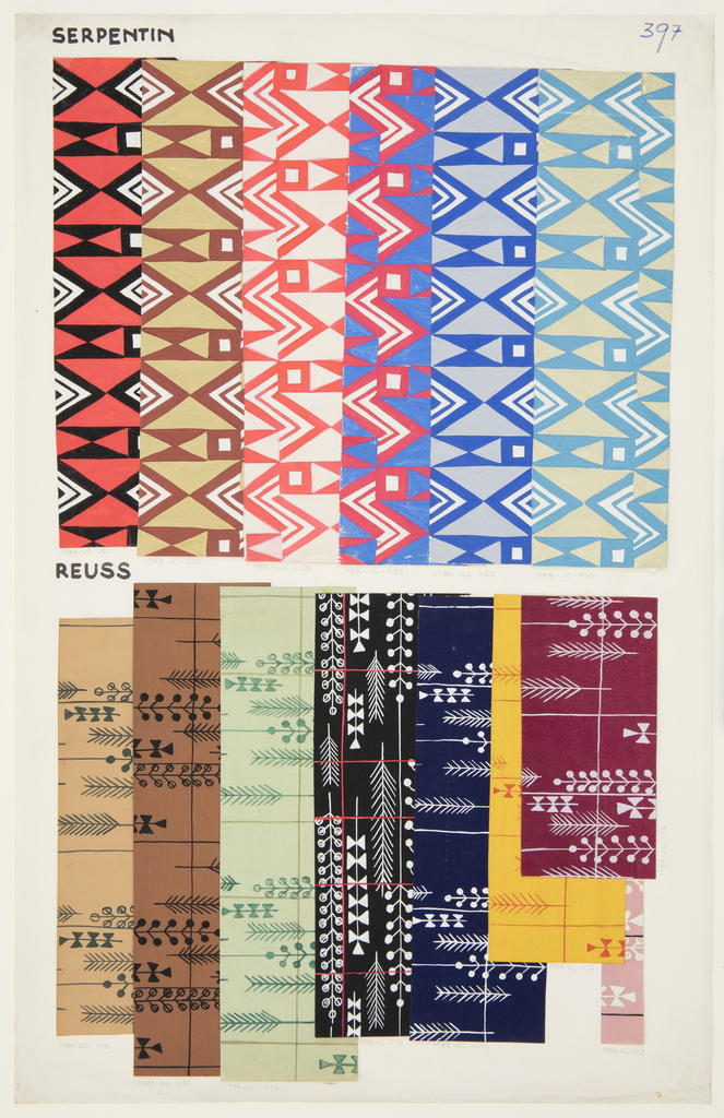 Drawing, Textile Design: Reuss; Made for Wiener Werkstätte (Austria); brush and gouache on paper; 19.1 × 5.1 cm (7 1/2 in. × 2 in.) Mat: 55.9 × 40.6 cm (22 × 16 in.); Museum purchase from Smithsonian Collections Acquisition and Decorative Arts Association Acquisition Funds; 1988-62-474